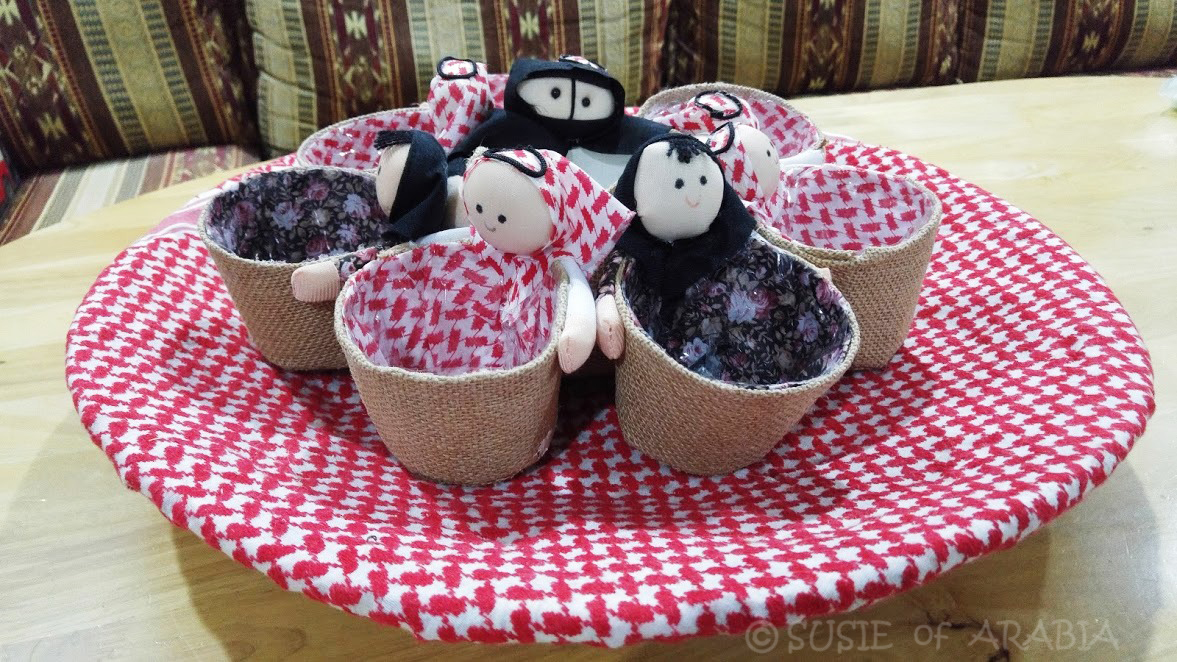 This photo is of a gift I received from my husband's lovely sister. It is a large platter shaped basket (about 2 feet across), covered with the red and white checkered scarf that Saudi men wear. The smaller accompanying cups are made to be little Saudi characters holding baskets. Handicrafts such as this are becoming very popular and more commonly found. I love finding things like this to take back to my family and friends as souvenirs.